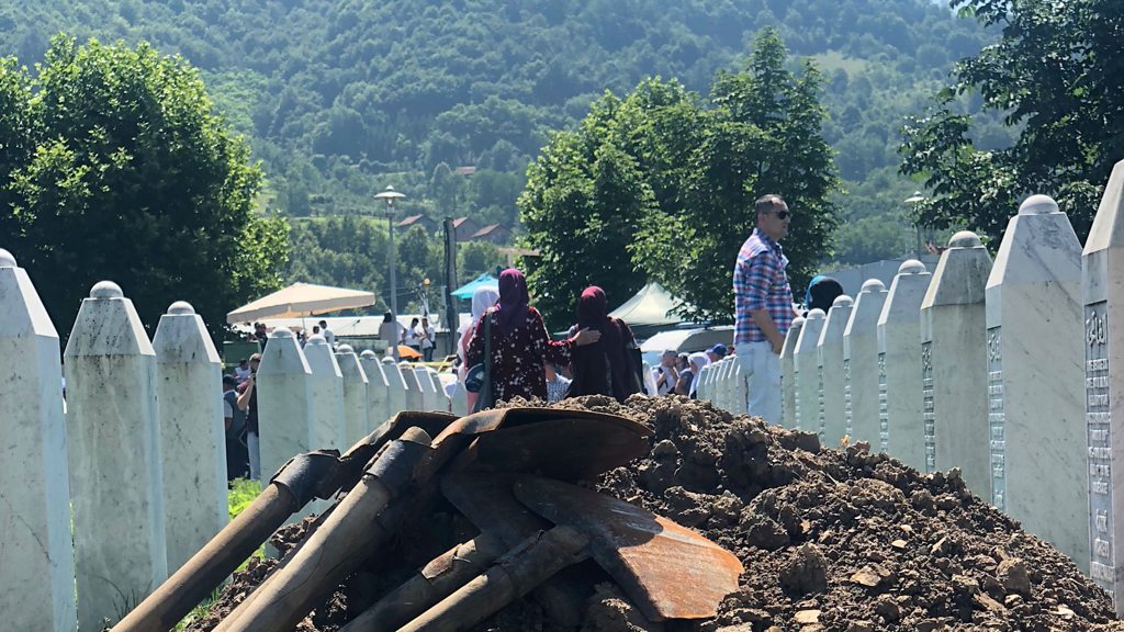 On July the 11th every year, the bodies of those who Sasa helped to identify over the past 12 months are re-buried in a Muslim service and Anna will witness the ceremony at the sprawling Potocari Cemetery and meet the families on a pilgrimage to honour the ones they loved and lost. Anna Holligan has listened to the details of unspeakable terror as the BBC’s correspondent in The Hague and will travel to the scenes of Mladic’s crimes to meet the Muslim families still haunted by the war of 25 years ago and the massacre of thousands at Srebrenica. Sasa was four years old when soldiers drove into his home town of Mostar – his family was a mix of Bosnian Muslim and Serbian Orthodox and the war ripped it apart. He is now a translator, and recently worked at the trial of Ratko Mladic. Samir Chosić is shovelling earth, a job that stirs his own painful memories of fleeing for his life, as thirty-five freshly dug graves readied for fragments of bones to be laid to rest. An estimated 12,000 people of all faiths, Muslims, Christians, Jews and others are still missing - feared slaughtered - right across this troubled Balkan territory. As she travels around Bosnia-Herzegovina, Anna witnesses a country officially at peace, but more religiously divided than it was before the war. Presented by Anna Holligan Photo title: The 11th July memorial at Srebrenica, Bosnia-Herzegovina Credit: BBC