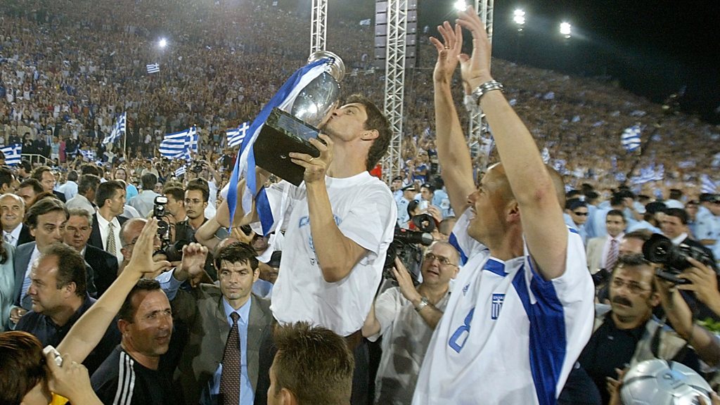 In July 2004, Greece pulled off one of the biggest shocks in football history by winning the European Championship with a 1-0 victory over Portugal. The Greeks had never previously scored a point in tournament football, but fought their way to the final thanks to set-pieces and a well-marshalled defence. Charlotte North talks to the Greek goal-scorer, Angelos Charisteas. The programme is a Whistledown Production. PHOTO: Angelos Charisteas celebraring with the Euro 2004 trophy (Getty Images)