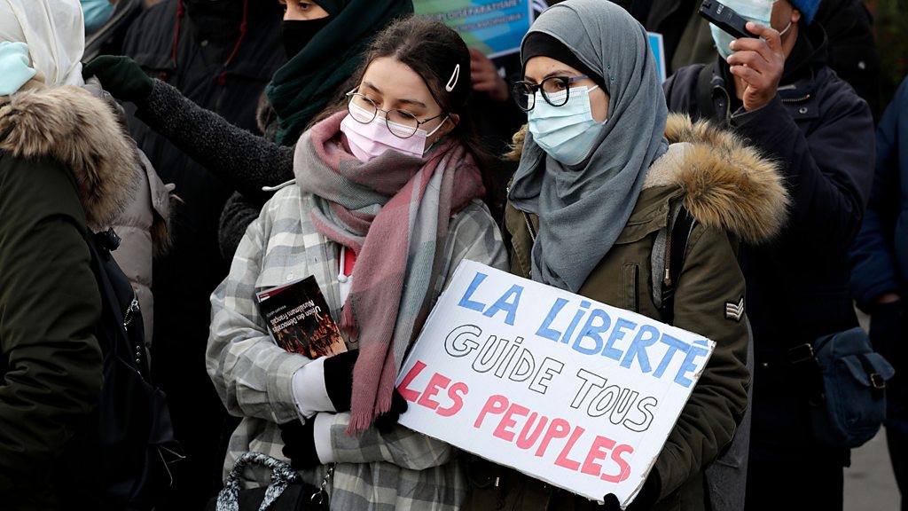 France is on its way to passing The Bill Comforting the Respect of Republican Principles, one of the most controversial laws of President Macron’s presidency. It aims to fight back against what Emmanuel Macron and his ministers are calling “Islamist separatism”, what he says is an assault by Islamist extremists on the values of the French Republic. John Laurenson meets people on both sides of this fractious debate. He visits a closed-down Paris school that its head teacher says is an early victim of President Macron’s war against “Islamist separatism” and meets another teacher – also Muslim - who describes her struggle with what she says is religious extremism in the classroom. John meets an MP and the head of a militant secularist organisation both keen on the law. He also goes to Trappes, a suburb of Paris that many say is a breeding ground for Islamic extremism, and drinks mint tea with a scholar of Islam. He meets an Islamic bookseller called John, goes to the mosque and talks to the mayor, eats a “halal ham” sandwich, meets an inhabitant who says she lives “Islamist separatism” every day and another who says the new law stigmatises Muslims in general and will separate them still further from the non-Muslim people of France. (Photo: A woman holds a placard reading "Freedom leads all the people" as protesters demonstrate against a bill dubbed as "anti-separatism", in Paris. Credit: Geoffroy Van Der Hasselt/AFP/Getty Images)