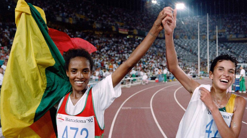 At the Barcelona Olympics in 1992, Derartu Tulu, from Ethiopia, became the first black African woman to win a gold medal. She speaks to Rachel Naylor about winning the 10,000 metres and beating South Africa's Elana Meyer. (Photo: Ethiopia's Derartu Tulu (L) and Elana Meyer of South Africa join hands in a victory lap after the women's 10,000m final at Barcelona Olympics in 1992. Credit: Getty Images)