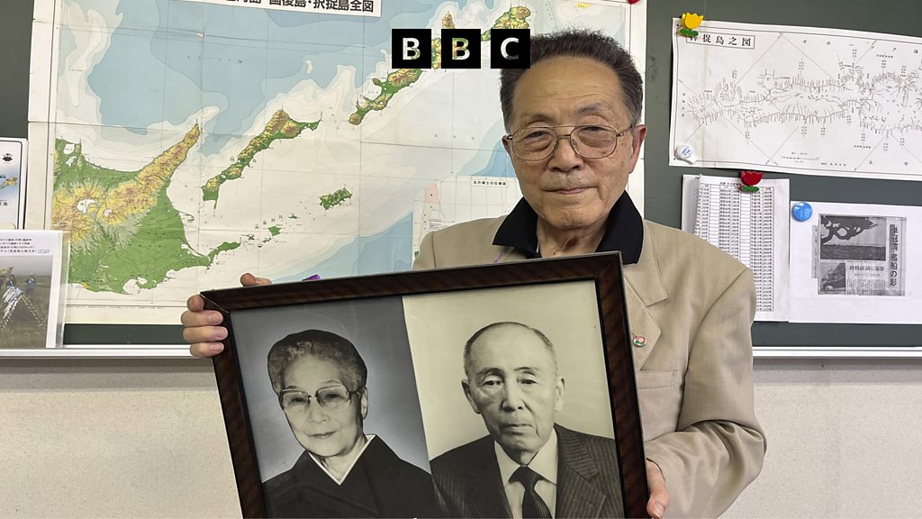 In 1947, thousands of Japanese families were expelled from their island homes by Soviet troops. They were taken from the Northern Territories, also known as the Southern Kurils, after the Soviet Union took control of the islands. Japan and Russia have failed to sign a peace agreement after World War Two because of the dispute. Yuzo Matsumoto, who's now 81, has been speaking to Laura Jones. (Photo: Yuzo Matsumoto with photos of his parents, standing in front of a map of Etorofu. Credit: BBC)