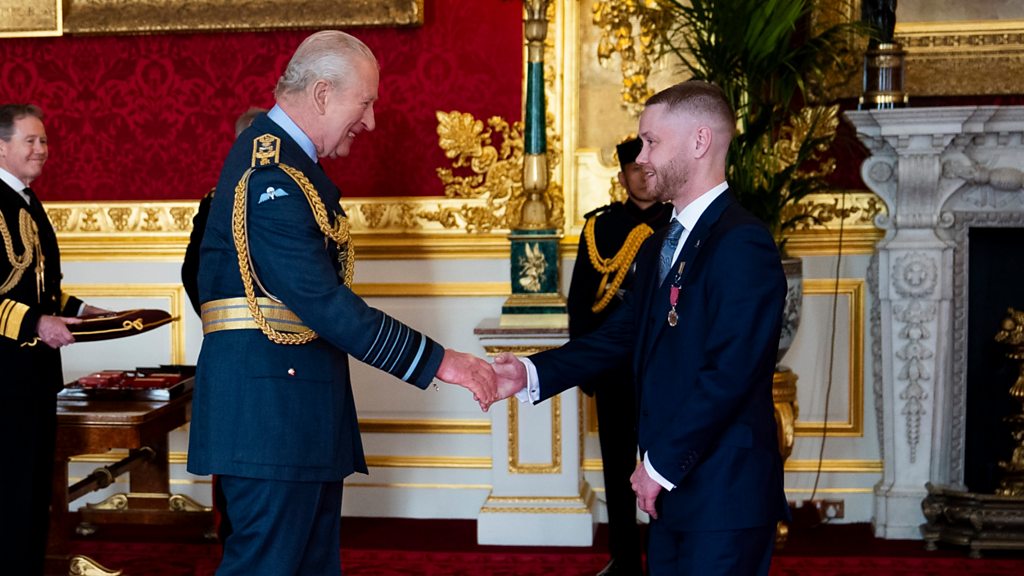 A patient who stopped a bomb attack at a hospital has revealed he hugged the would-be-attacker to calm him down. Nathan Newby spent two hours talking to the armed man and persuaded him to abandon his plan. He received the George Medal for bravery from King Charles this week. Also: how a viral video of pack of dogs has captured the attention of animal lovers across China and beyond. England's Football Association has apologised to a women's team who defied its fifty-year ban on female players. The sport's governing body praised the Manchester Corinthians as trailblazers. And: Millions of people are flocking to see Washington DC's beloved cherry trees in full bloom. The National Cherry Blossom Festival celebrates international friendship, as the trees were a gift from Tokyo over a hundred years ago. Presenter: Holly Gibbs Music composed by Iona Hampson (Photo: Nathan Newby receiving the George Medal from King Charles. Credit: PA News)