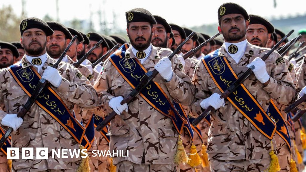 ![Jeshi kuu la Iran [Islamic Revolution Guard Corps] IRGC linakadiriwa kuwa zaidi ya 150,000 ambao wanahudimia taifa](https://ichef.bbci.co.uk/ace/ws/640/cpsprodpb/D1AB/production/_109557635_gettyimages-1037635190.jpg.webp)
