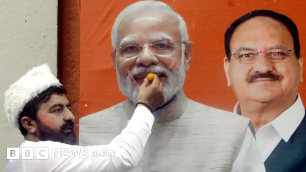 படக்குறிப்பு, தேர்தலில் முன்னிலை பெற்றதை இனிப்புடன் கொண்டாடும் ஐக்கிய ஜனதா தளம் தொண்டர்கள்