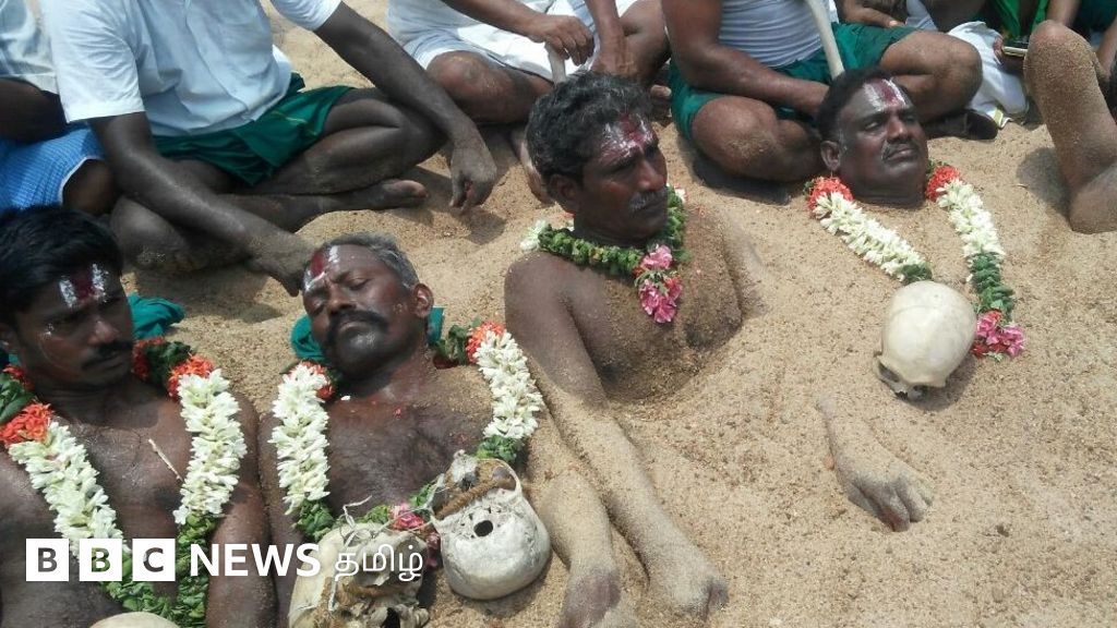 காவிரி மேலாண்மை வாரியம் அமைக்க வலியுறுத்தி தேசிய தென்னிந்திய நதிகள் இணைப்பு சங்கத் தலைவர் அய்யாக்கண்ணு உள்ளிட்ட விவசாயிகள் மணலில் புதைந்தும், நெற்றியில் நாமம் இட்டும், பிணம் போல கழுத்தில் மாலை அணிந்தும் நூதன போராட்டத்தில் ஈடுபட்டனர்.