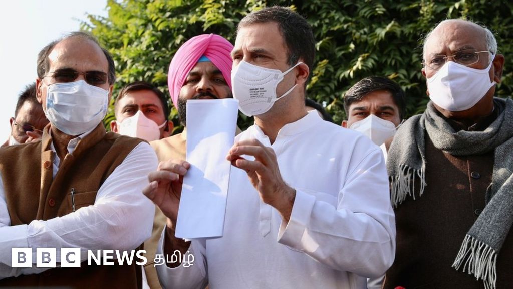 படக்குறிப்பு, நாடாளுமன்ற வளாகத்துக்கு வெளியே செய்தியாளர்களிடம் பேசும் காங்கிரஸ் முன்னாள் தலைவர் ராகுல் காந்தி.