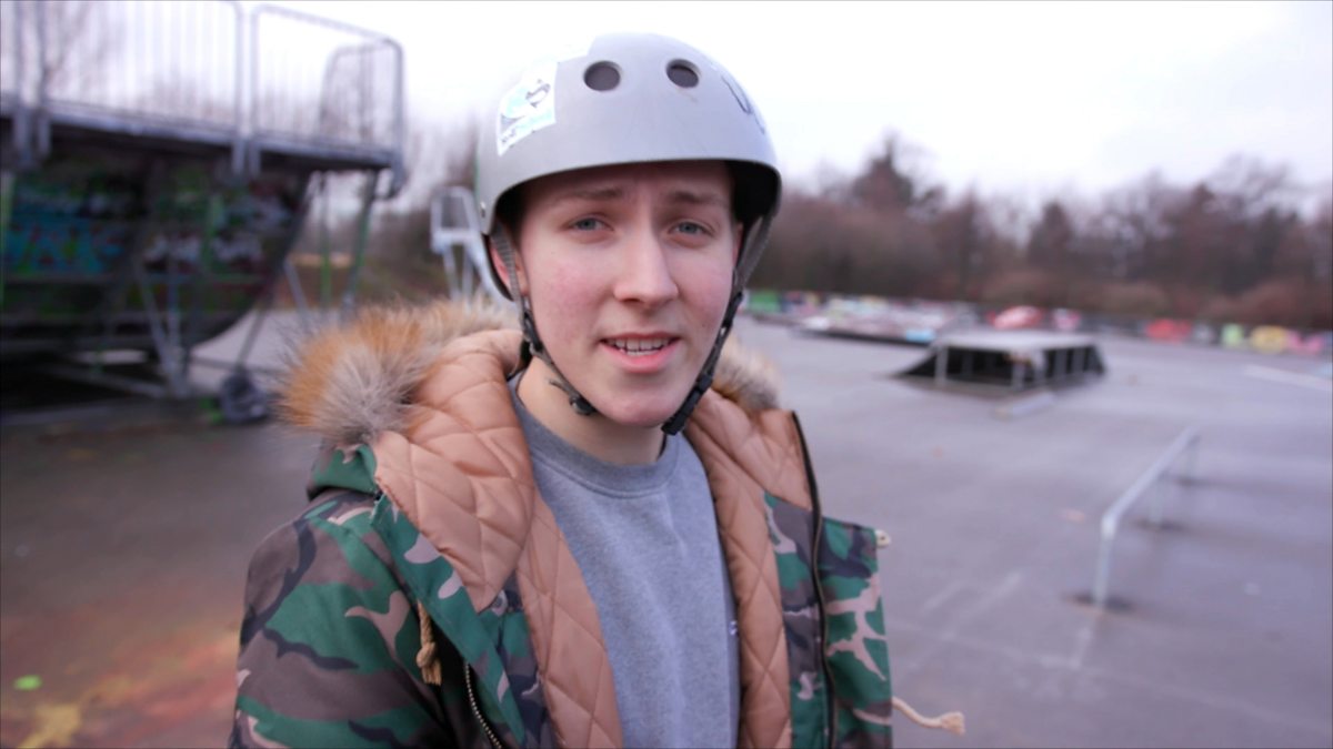A young German blogger is at a local skate park where he goes after school with his friends so that they can ride on their BMX bicycles.