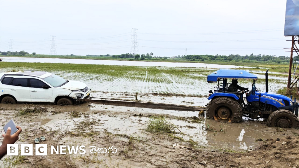 ఫొటో క్యాప్షన్, ఆంధ్రప్రదేశ్‌లోని ఎన్టీఆర్ జిల్లా నందిగామ దగ్గర పొలాల్లో కూరుకుపోయిన కార్లను ఇలా ట్రాక్టర్లతో బయటికి తీసుకొస్తున్నారు