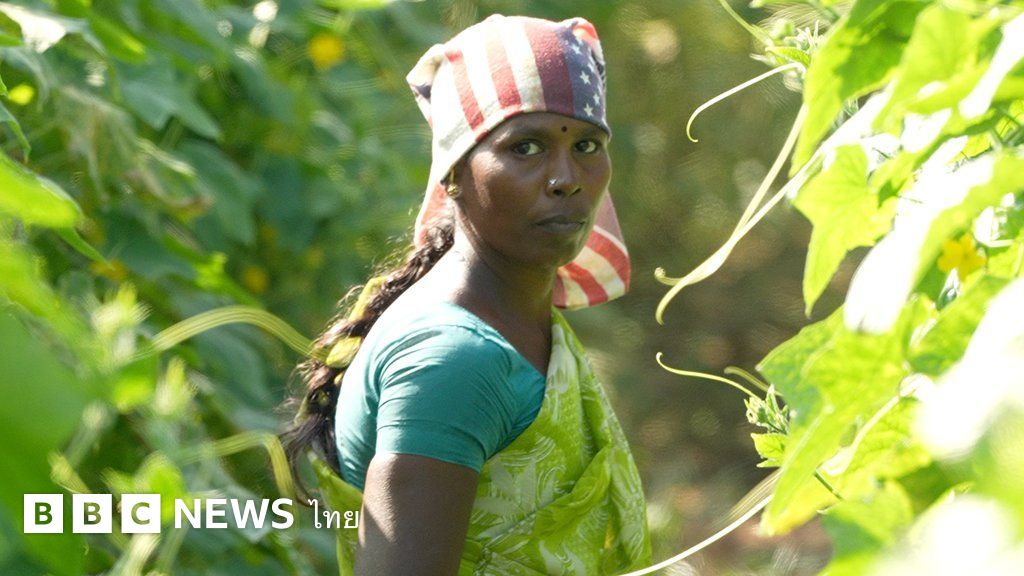สุมาธี ซึ่งถอดถุงมือชิ้นหนาออกแล้วเหยียดนิ้ว หลังจากเก็บแตงกวามาเป็นเป็นเวลาสองชั่วโมง