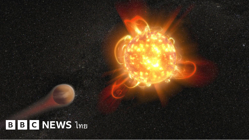 คำบรรยายภาพ, ภาพจำลองดาวฤกษ์ชนิดดาวแคระแดง (ขวา) ขณะเกิดซูเปอร์แฟลร์ที่ปลดปล่อยพลังงานอย่างรุนแรง จนทำลายชั้นบรรยากาศของดาวเคราะห์บริวาร (ซ้าย)