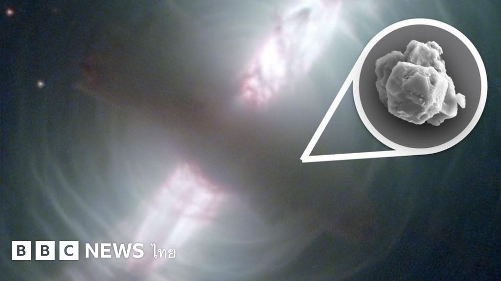 คำบรรยายภาพ, เม็ดฝุ่นที่เกิดก่อนระบบสุริยะ (ภาพเล็ก) ซึ่งนักวิจัยพบในอุกกาบาต อาจเดินทางมาจากกลุ่มดาวฤกษ์โบราณเช่นที่มีอยู่ในเนบิวลารูปไข่