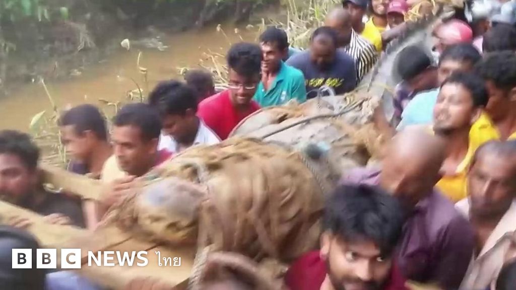 ชาวบ้านในศรีลังกาช่วยกันจับจระเข้ยักษ์ส่งมอบให้แก่ทางการ หลังจากผู้หญิงคนหนึ่งพบมันโดยบังเอิญขณะเก็บใบชา