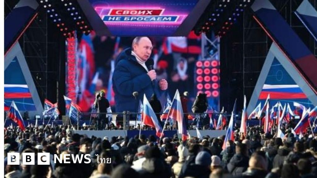 ประธานาธิบดีวลาดิเมียร์ ปูติน ของรัสเซีย ขึ้นกล่าวปราศรัยในงานเฉลิมฉลองครบรอบ 8 ปีการผนวกดินแดนไครเมีย ที่สนามกีฬาลูชนิกิในกรุงมอสโก