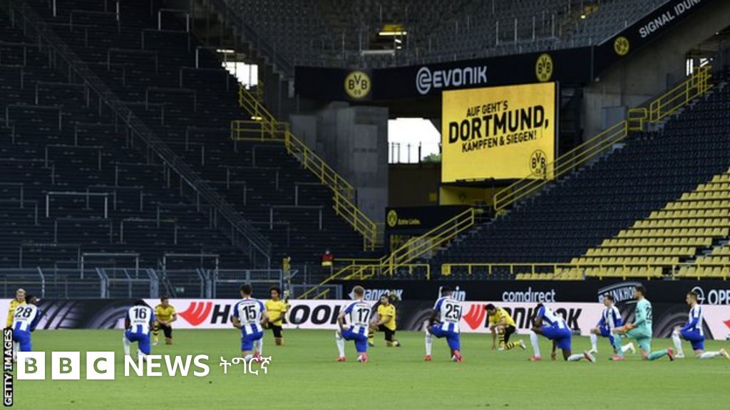 ተጻወትቲ ቦሩስያ ዶርትመንድ ከምኡ ድማ ሄርዛ በርሊን፡ ቅድሚ ጸወታ ምጅማሮም፡ ኣብ ማእኸል ሜዳ ብምንብርካኽ ድጋፎም ኣርእዮም።