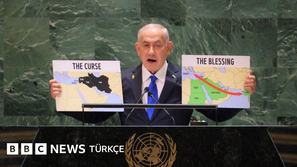 Netanyahu da, Birleşmiş Milletler (BM) Genel Kurulu'nda yaptığı son konuşmada iki harita ile temsilcilerin karşısında çıktı.