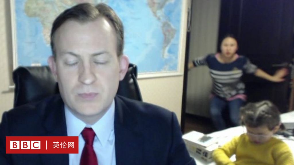 韩国釜山国立大学罗伯特•凯利教授(Robert Kelly)在家评论韩国政治时,他的两个小孩进入房间,他试图保持冷静,他的太太急忙把两名“小小入侵者”拖出房间。