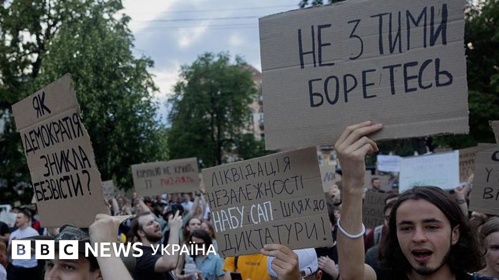 У столиці люди прийшли до театру Франка, який розташований зовсім поруч з офісом президента. Люди тримають плакати з закликами на захист антикорупційних органів: "Як демократія зникла безвісти", "законопроєкт №12414 - прямий шлях до Росії", "Жопу собі ліквідуйте". Більшість плакатів написані на картонках. На них написано дуже багато матюків.