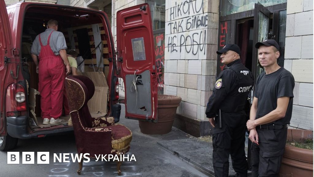 На фото видно, що біля салону знаходиться автомобіль служби охорони. Також біля вхідних дверей стоїть мікроавтобус, до якого вантажать меблі.