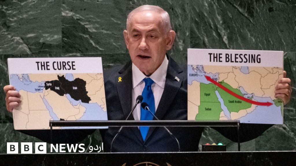 اقوام متحدہ کی جنرل اسمبلی سے خطاب کے دوران اسرائیلی وزیر اعظم نے اسرائیل کے دو نقشے پیش کیے۔ ان میں سے ایک نقشے میں ان تمام ممالک کو سبز رنگ میں دکھایا گیا جو اسرائیل کے ساتھ امن معاہدے کا حصہ ہیں یا اسرائیل کے ساتھ اپنے تعلقات کو بحال رکھنے کے خواہاں ہیں۔