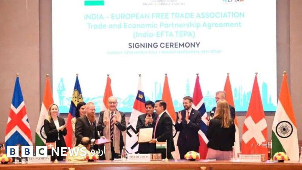 انڈیا نے چار یورپی ممالک کے ساتھ فری ٹریڈ یا آزاد تجارت کا معاہدہ کیا ہے۔ ملک کے کامرس اور صنعت کے وزیر پیوش گوئل نے سوشل میڈیا پلیٹ فارم ایکس (سابقہ ٹوئٹر) پر معاہدے کے بارے میں بتایا کہ یہ چار یورپی ممالک انڈیا میں 100 ارب ڈالرز کی سرمایہ کاری کریں گے۔