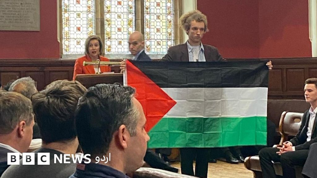نینسی پلوسی جب ہال میں داخل ہوئیں تو طلبہ کی تالیوں کی گونج کے ساتھ آکسفورڈ یونیورسٹی کے باہر فلسطینیوں کے حق میں مظاہرین کے نعرے بھی صاف سنائی دے رہے تھے۔