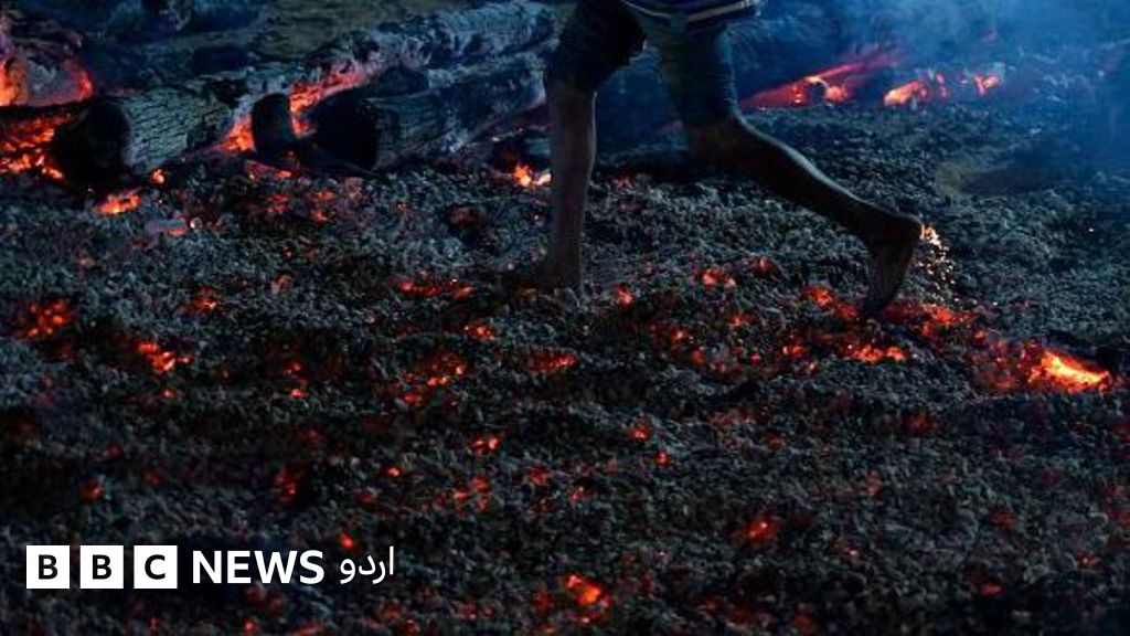 ہاتھوں میں ایک بڑی سی لاٹھی اٹھائے کچھ لوگ ننگے پاؤں ایک گڑھے میں موجود دہکتے ہوئے انگاروں سے گزر رہے ہیں اور وہاں سے نکلنے کے بعد لوگ ان کو اٹھا کر ایک چادر پر لے جاتے ہیں اور ان کے پیروں پر کوئی چیز ملتے ہیں۔