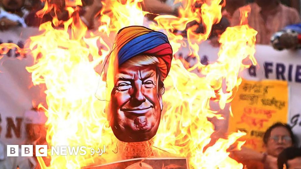 ،تصویر کا کیپشنپاکستان اور انڈیا کے درمیان ’سیزفائر‘ کے اعلان کے بعد انڈیا کی اپوزیشن جماعت کانگریس نے کلکتہ میں ایک احتجاجی مظاہرے کے دوران امریکی صدر ٹرمپ کے پُتلے کو نذر آتش کیا