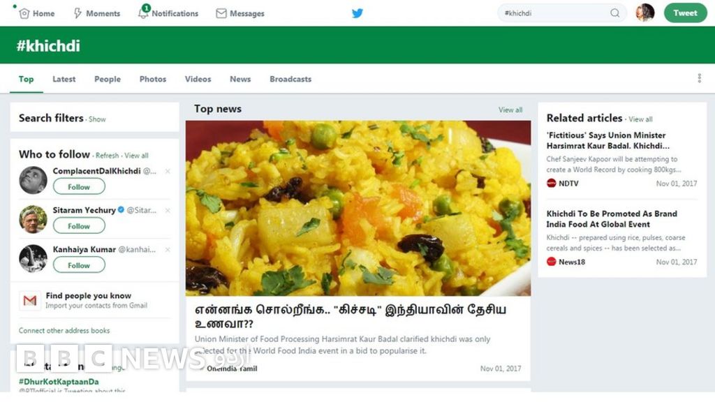 تو ہوا یوں کہ کہیں سے ٹوئٹر پر یہ خبر چل پڑی کہ انڈیا کچھ دن بعد، ایک تقریب میں، کھچڑی کو اپنے قومی پکوان کا درجہ دینے والا ہے۔ بس پھر کیا تھا، دیکھتے ہی دیکھتے ٹوئٹر پر اس کی حمایت، اس کے خلاف، اس پر طنز اور مذاق کی پوری دعوت لگ گئی۔ بات یہاں تک پہنچ گئی کہ ایک وزیر کو اس بحث میں کود کر وضاحت دینا پڑی۔