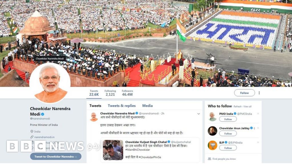 انڈیا کے وزیر اعظم نریندر مودی نے اپنے ٹوٹر پیغام میں MainBhiChowkidar# ہیش ٹیگ استعمال کیا اور اپنے اکاؤنٹ پر اپنا نام تبدیل کر کے چوکیدار نریندر مودی رکھا۔ اس مہم کے ساتھ ہی یہ سوشل میڈیا پر ٹرینڈ کرنا لگا۔ اُن کی دیکھا دیکھی بی جے پی کے وزرا، رہنماؤں اور حامیوں نے بھی ٹوئٹر پر اپنے ناموں کے ساتھ چوکیدار لگایا۔ انڈیا میں ChowkidarNarendraModi# اور دنیا بھر میں ChowkidarPhirSe# ٹرینڈ کر کررہا ہے۔