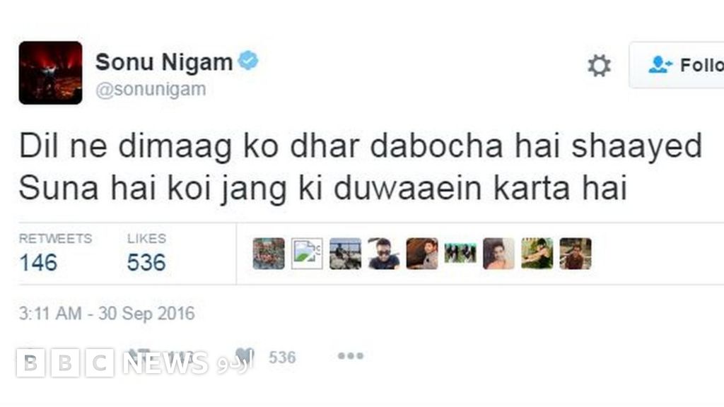 حالیہ صورتحال کے بارے سونو نگھم نے یہ شعر ٹویٹ کیا ہے: