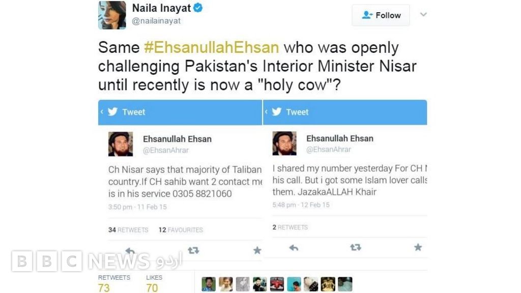 نائلہ عنایت نے سوال کیا ہے کہ ’یہ وہی احسان اللہ احسان ہیں جس نے پاکستان کے وزیر داخلہ کو کھلے عام چیلنج کیا تھا اور اب وہ کیسے مقدس گائے بن گئے؟‘