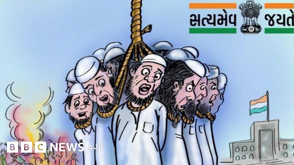 گجرات بی جے پی کے آفیشل ٹویٹر ہینڈل @BJP4Gujarat سے پوسٹ کیے گئے اس متنازع کارٹون میں ٹوپیاں پہنے اور داڑھیوں والے افراد کو پھانسی چڑھتے دیکھایا گیا تھا اور ساتھ لکھا تھا ’ستیا میں وجیت‘ یعنی آخر میں سچ کی جیت ہوتی ہے اور ’دہشت گردی پھیلانے والوں کو بخشا نہیں جائے گا۔‘