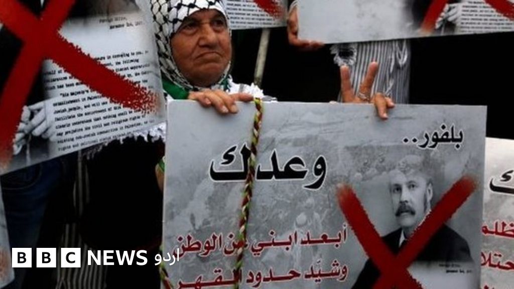 یہ فلطسین کے علاقے بیت الہم کا منظر ہے جہاں مظاہرین اس معاہدہ بیلفور کے روح رواں آرتھر بیلفور کی تصویر کو اٹھائے ہوئے ہیں اور مذمت کا اظہار کرنے کے لیے اس پر ’شیم‘ لکھا گیا ہے۔