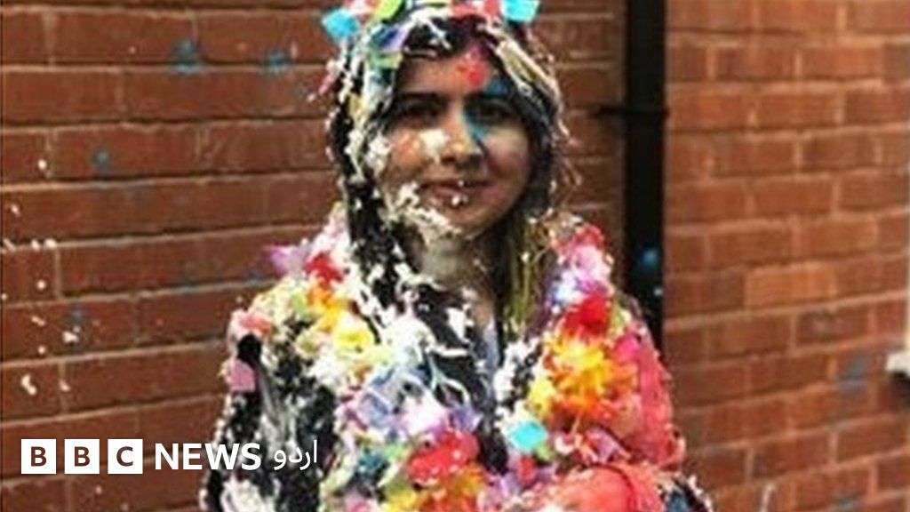سوشل میڈیا پر ایک دوسری تصویر میں ملالہ کیک میں لت پت نظر آ رہی ہیں۔ برطانیہ کی یونیورسٹیوں میں اس روایت کو ’ٹریشنگ‘ کہا جاتا ہے جس میں فائنل امتحانات کے بعد سٹوڈنٹ ایک دوسرے پر کھانے پینے کی اشیا پھینکتے ہیں۔