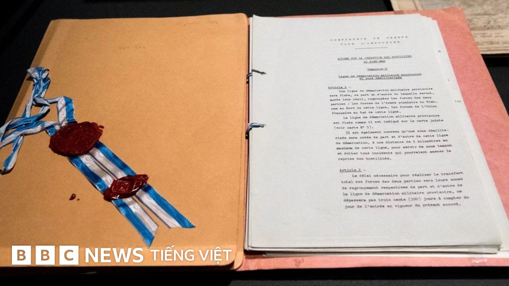 Văn bản Hiệp Định Geneve trưng bày bản gốc tiếng Pháp và tiếng Việt, các trang liên kết với nhau bằng 2 dải dây lụa xanh trắng, trang bìa gắn dấu xi chữ ký Cộng Hòa Pháp và quốc huy của Việt Nam Dân Chủ Cộng Hòa.