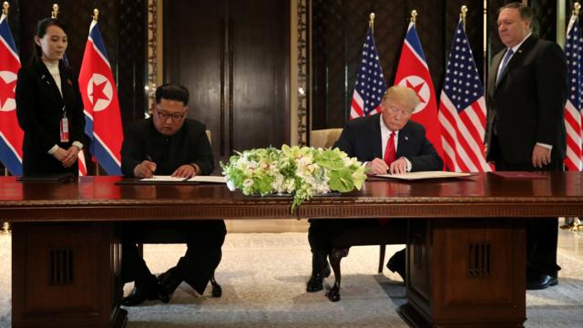 "Với các hình ảnh của Tổng thống Trump và Chủ tịch Kim Jong-un tại cuộc gặp để tái dựng lịch sử, để tỏa sáng dưới ánh mặt trời. Một khoảng khắc, một sự lựa chọn. Tương lai vẫn còn chờ được viết."