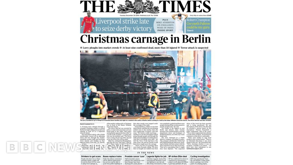 Chụp lại hình ảnh, Các trang báo tại Anh hôm 20/12 tập trung nói về cái chết của chín người ở chợ Giáng sinh tại Berlin, sau khi một xe tải đâm thẳng vào chợ.