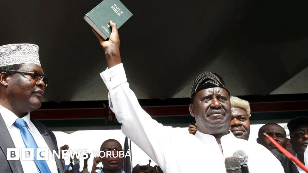 Ogbeni Odinga gba ibura oun nigba ti o di bibeli alawo ewe dani ni iwaju ogunlọgo awọn alatilẹhin re ni papa igbafe Uhuru ni Nairobi, olu ilu ilẹ Kenya.